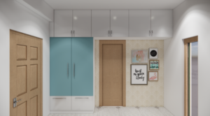 A U-shaped kitchen featuring a soothing sky-blue color scheme with matched dado tiles. The walls and cabinetry are painted in a soft, airy sky blue, creating a calm and refreshing atmosphere. The dado tiles, which extend around the kitchen, perfectly match the wall color, adding a sense of continuity and balance to the space. The U-shape design maximizes the kitchen’s functionality, offering ample counter space and storage, while the consistent blue tones create a cohesive and inviting environment. The tiles’ subtle patterns or textures might add a touch of elegance without overwhelming the tranquil color palette.