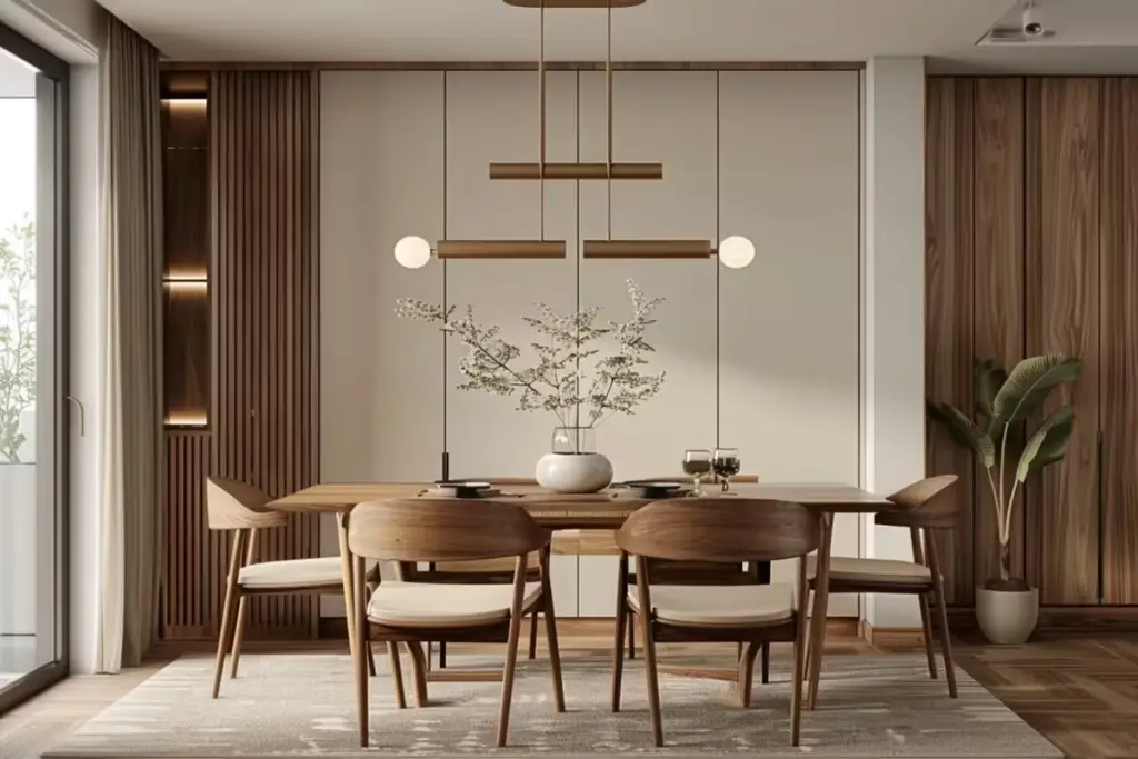Mid-Century Modern 4-Seater Wood And Beige Dining Room Design With Long Seater