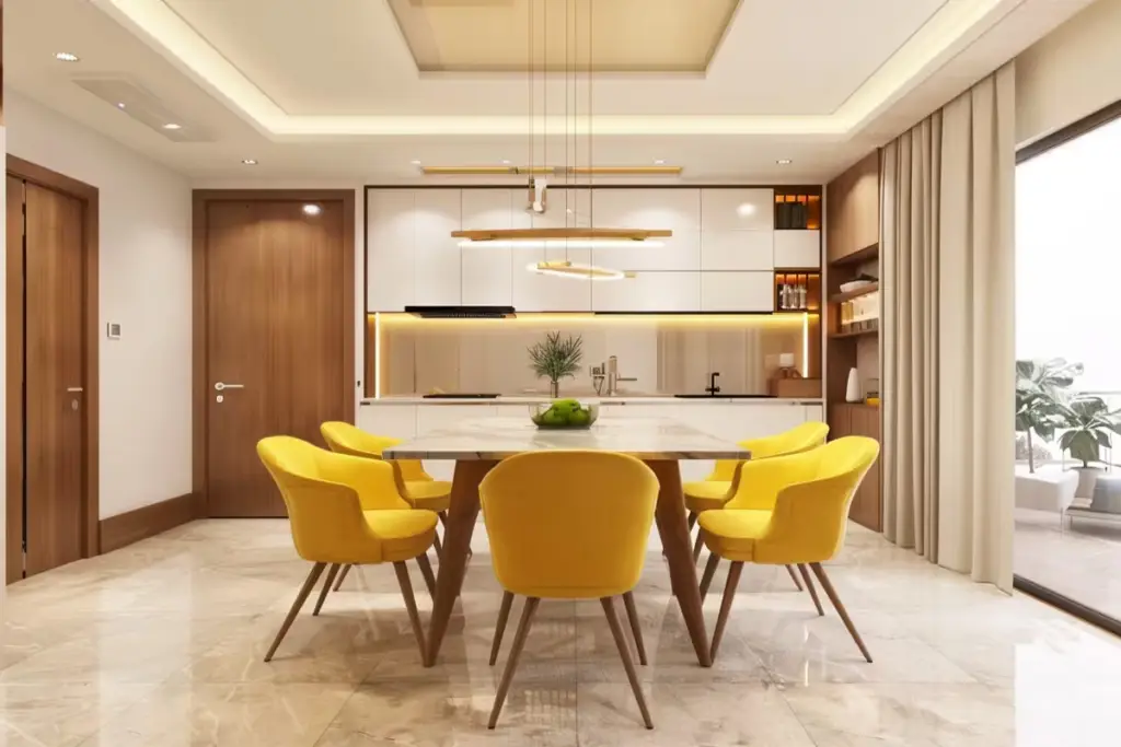 Modern 6-Seater Wood And Off-White Dining Room Design With Yellow Chairs
